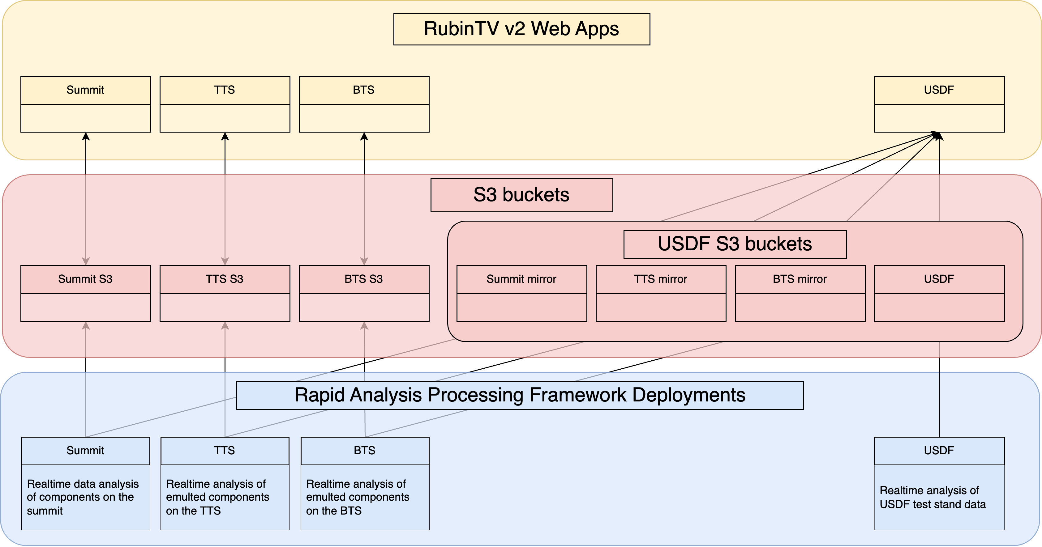 Rapid Analysis at the Summit performs ongoing data transfers of images to the rubin-rubintv-data-usdf Embargo S3 bucket at USDF. There is a RubinTV is a web application that displays these images.